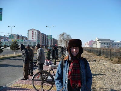 Me in Baicheng, wearing a brand new winter hat I bought from one of the vendors behind me.