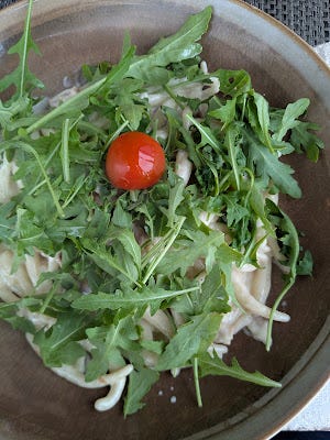 On the other hand, I made a delightful, accidental discovery my second day here. I went an had lunch at one of the few restaurants still open (there will be even fewer when the shoulder season ends), and picked something that sounded good - an Istrian pasta served with arugula, prosciutto, and a cherry tomato. Sounds good, right? And it was. But here's the thing. The sauce? White cheese sauce. The noodles? Actually long dumplings. I had basically ordered Spaetzle (a German dish, though the dumpling-noodles are typically shorter and/or thinner than these were) with fresh vegetables, lol. So for my first meal, without trying to, I found Istria's mac 'n' cheese. Good times.